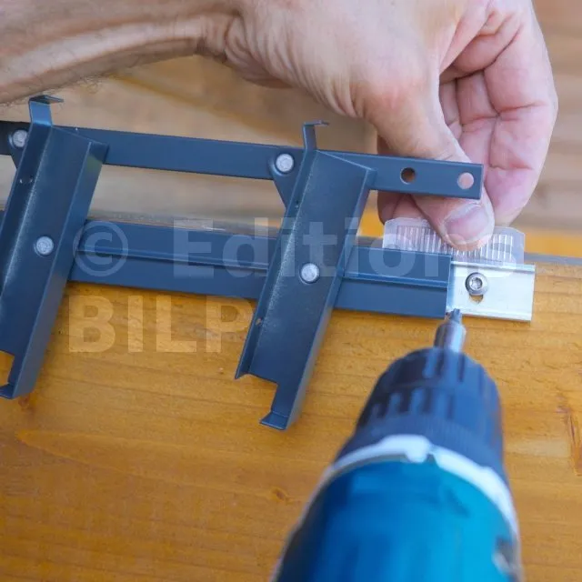 Fixation invisible : Les mécanismes sont assemblés entre eux par un embout spécial, lui même fixé sur le support (poutre de la pergola par exemple). La fixation doit être de diamètre 5mm, en INOX. Sa longueur et sa nature dépendent du support :