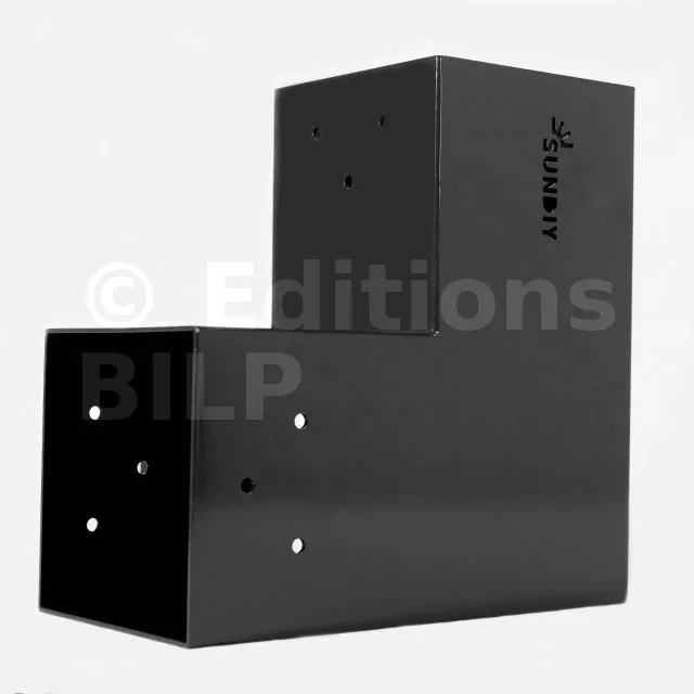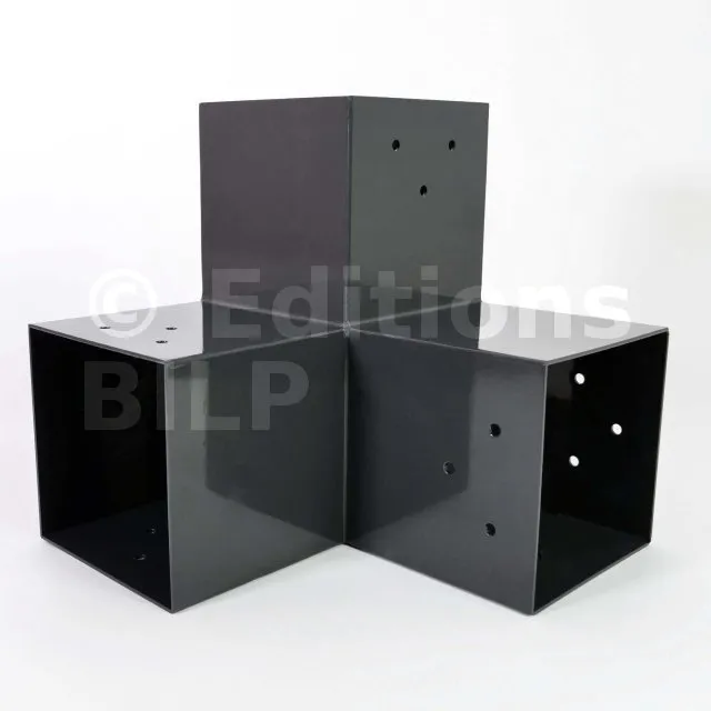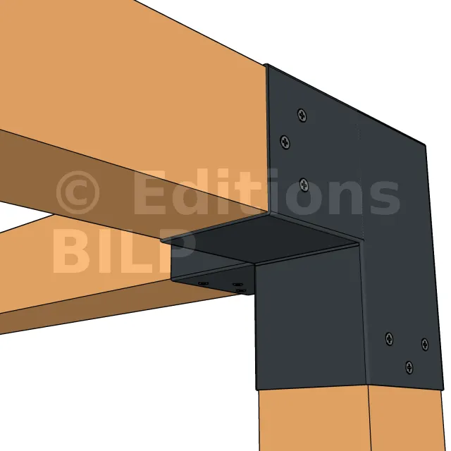 Il est utilisé dans un angle extérieur. Ce connecteur va permettre de raccorder une poutre 90x90mm perpendiculairement à une poutre 90x90mm, le tout étant supporté par un poteau vertical 90x90mm.