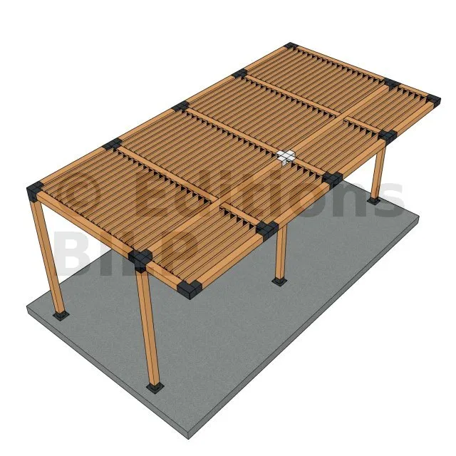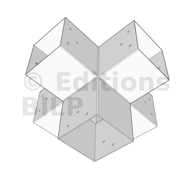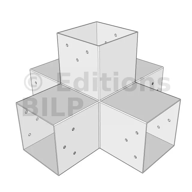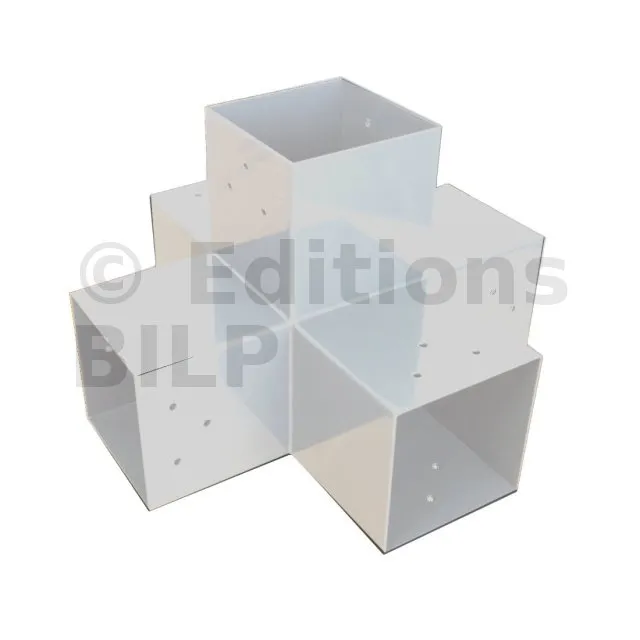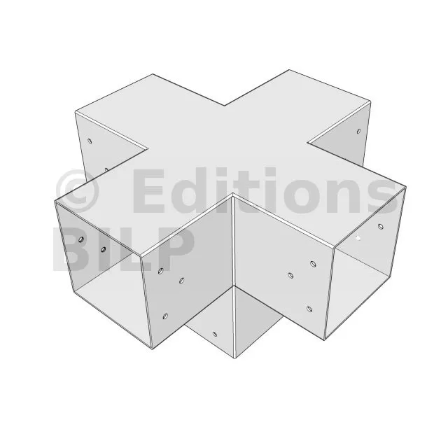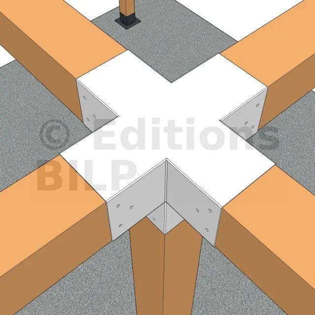 Il permet de raccorder deux poutres 120x120mm perpendiculairement à une autre poutre 120x120mm, le tout étant supporté par un poteau vertical de 120x120mm.