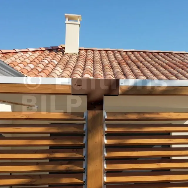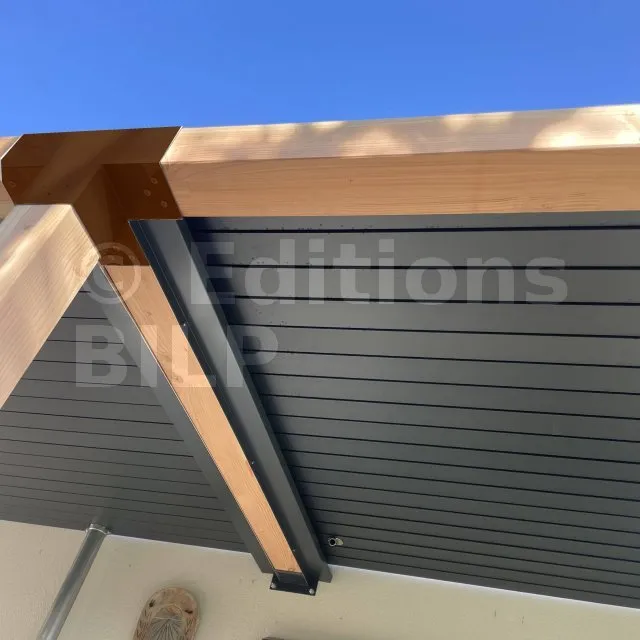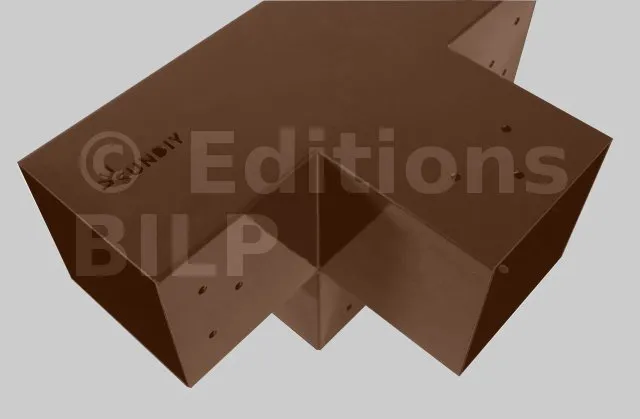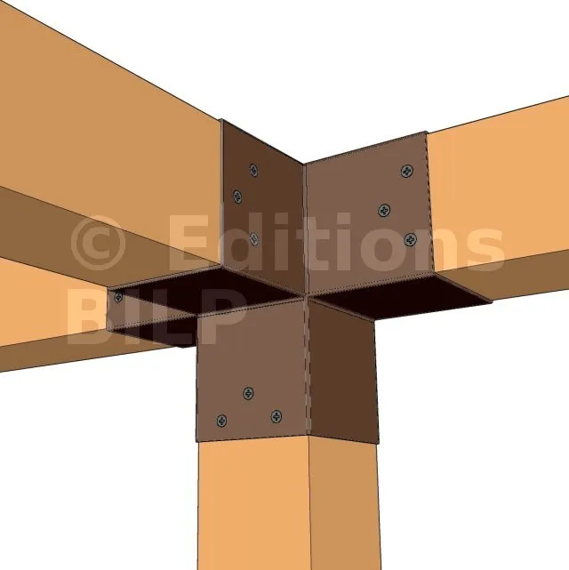 Il permet de raccorder une poutre de 90x90mm perpendiculairement à un chevron de 90x90mm, le tout étant supporté par un poteau vertical de 90x90mm.