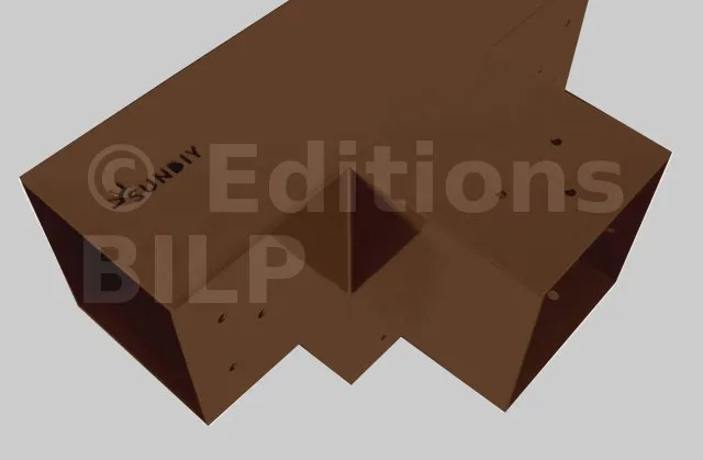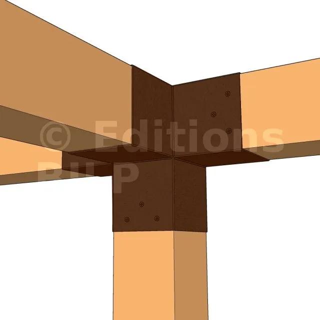 Il permet de raccorder une poutre de 120x120mm perpendiculairement à un chevron de 120x120mm, le tout étant supporté par un poteau vertical de 120x120mm.