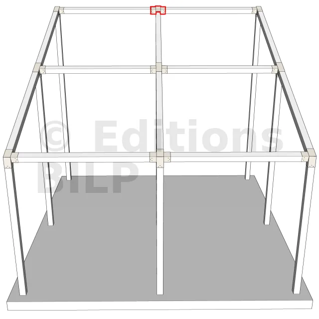 Connecteur d’angle intérieur à quatre directions conçu pour l’assemblage de poutres en section 120x120 mm avec un chevron de même section incliné à 20°. Il assure la jonction structurelle entre les éléments horizontaux, le chevron incliné et un poteau porteur vertical en 120x120 mm.