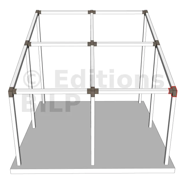 Il est utilisé dans un angle extérieur. Ce connecteur va permettre de raccorder une poutre 120x120mm à une poutre 120x120mm avec une pente de 20°, le tout étant supporté par un poteau vertical 120x120mm.