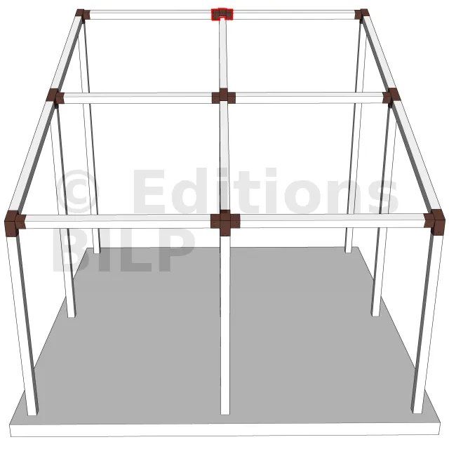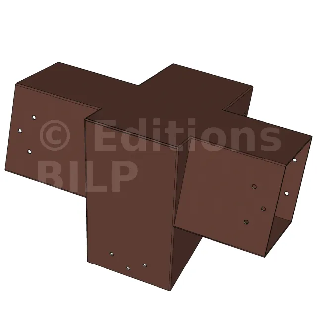 Connecteur d’angle intérieur à quatre directions conçu pour l’assemblage de poutres en section 120x120 mm avec un chevron de même section incliné à 20°. Il assure la jonction structurelle entre les éléments horizontaux, le chevron incliné et un poteau porteur vertical en 120x120 mm.