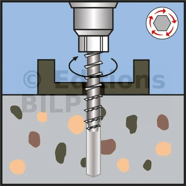La vis béton à tête hexagonale avec embase est un système de fixation par verrouillage de forme pour charges lourdes dans le béton fissuré et non fissuré. Elle permet une mise en œuvre plus rapide que les chevilles standards pour des applications permanentes ou provisoires. Le filetage en dents de scie assure un accroche très performante.