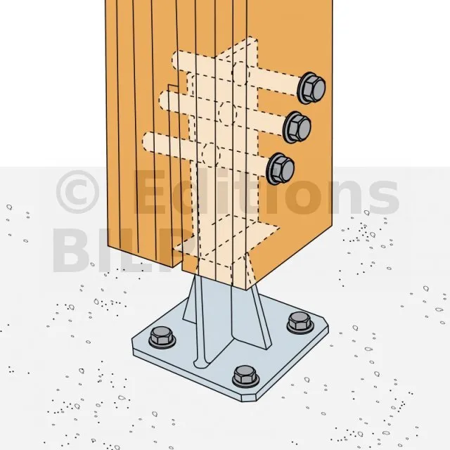 - Connexion bois sur support rigideSur poteau : 1 STD12 ; sur béton : 4Ø12 (goujons WA M12 ; tige filetée M12), sur acier : boulons