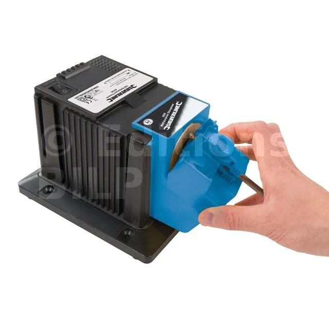 Appareil spécialement conçu pour réaliser l’affûtage de forets en acier HSS (acier rapide), burins, couteaux, ciseaux, fers de rabots, et autres lames. Comprend des gabarits afin d’obtenir un réglage de l’angle d’affûtage d’une grande précision. Garantit un affûtage rapide et soigné. Pour mèches en acier HSS (acier rapide) de 3 à 13 mm de diamètre et pour lames de 6 à 51 mm de largeur. Polyvalent et facile d’utilisation. Disques de meulage de rechange disponibles.