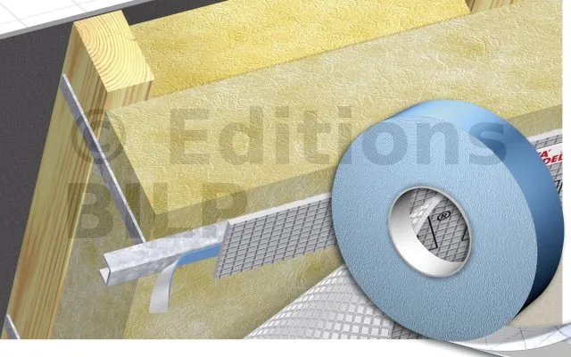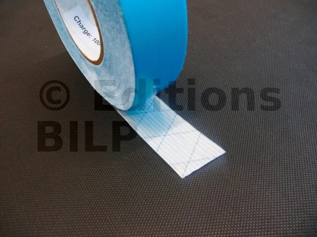 Ruban adhésif double-face armé bi-composants avec film pelable en sous-face permettant le maintien provisoire par collage du pare-vapeur sur le profilé métallique support de la plaque de plâtre.