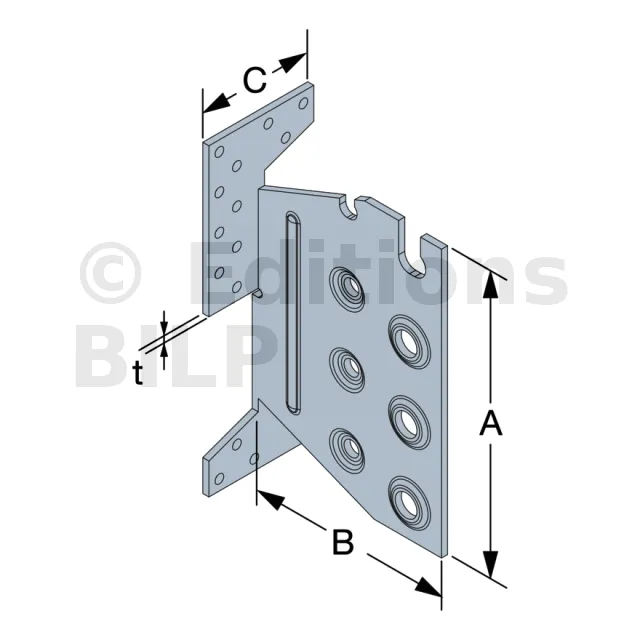 | Largeur | Hauteur | Largeur poteau | A | B | C | t | Ø5 | Ø8,5 | Ø12,5 | ||||
