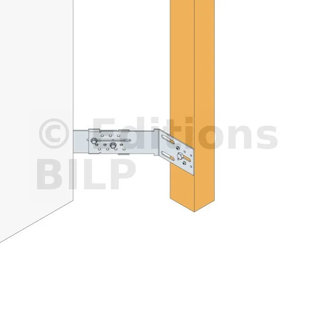 L’équerre AB45C permet de fixer le chevron d’angle, dans le cas d’un angle sortant. Ce chevron d’angle appartient à l’ossature secondaire de la structure. Cette ossature sert de support aux revêtements extérieurs de type bardage.