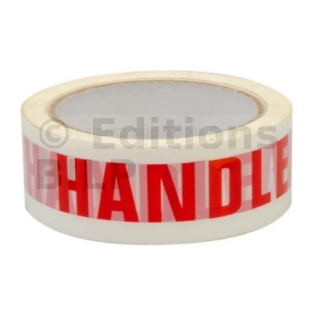 Lettres rouges sur fond blanc indiquant la mention en anglais HANDLE WITH CARE.