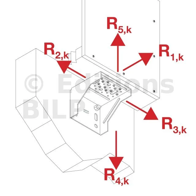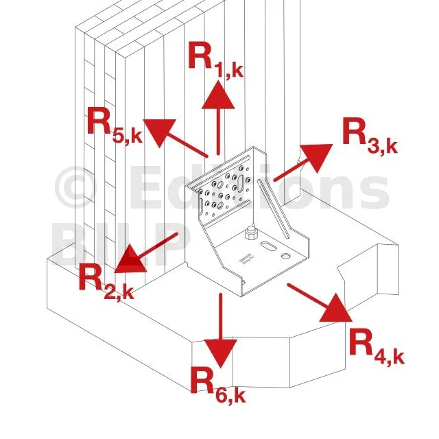 Les résistances données dans ce tableau sont des résistances maximum. Il convient de vérifier la reprise de charge des ancrages. Si les ancrages n’ont pas une capacité suffisante, les charges de l’ACW155 doivent être réduites. De même, si la fixation à l’élément bois est réalisée avec des boulons ou des tirefonds, il faut alors vérifier que la charge puisse être reprise par ces fixations. Enfin, les reprises de charges données pour la configuration "Sur la dalle" sont vraies uniquement s’il n’y a pas de rotation possible de l’élément bois.