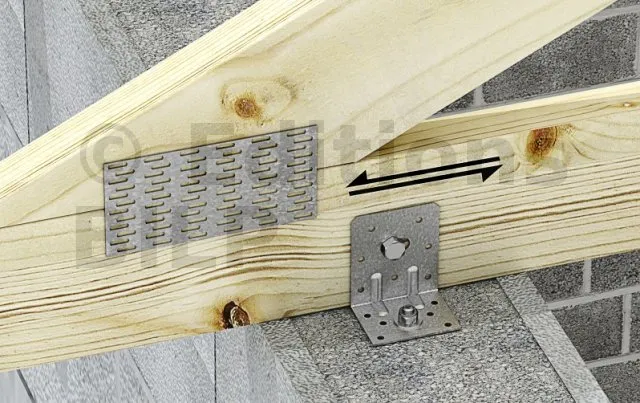 Dans le cas d’un déplacement calculé de la ferme de plus de 6 mm, il faut alors réaliser un appui glissant. Le glissement est autorisé par le trou oblong situé sur nos équerres (source DTU 31.3, P3/5.3.3)