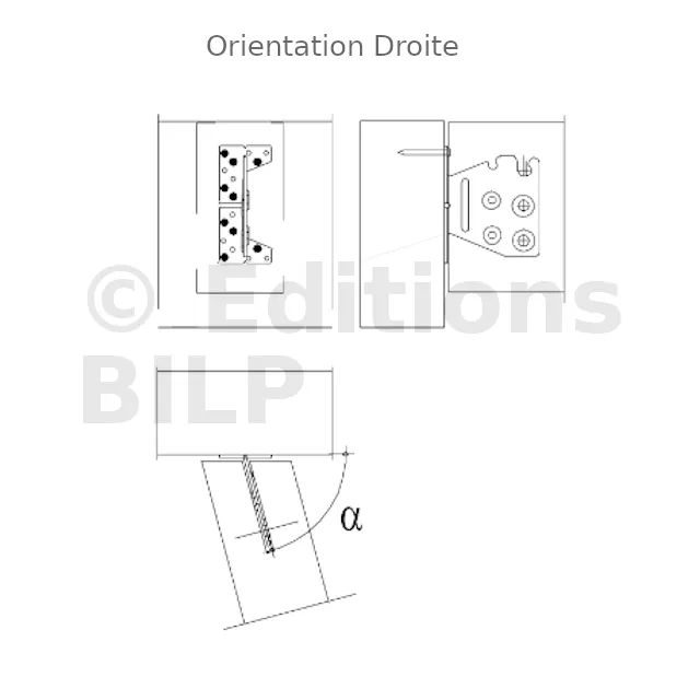 | Largeur | Hauteur | Largeur poteau | A | B | C | t | α [°] | Ø5 | Ø8,5 | Ø12,5 | ||||||