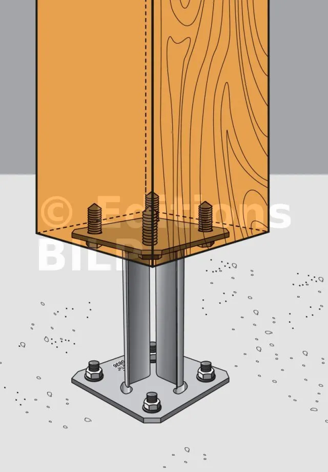 - Fixation des éléments bois (chevrons, solives, poteaux, etc) sur platines métalliques.