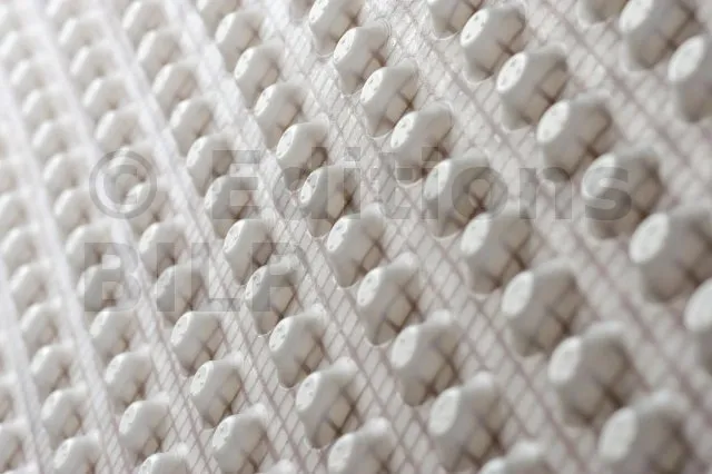 - MatériauNappe à excroissances en polyéthylène haute densité associée à un treillis en polyéthylène brun.