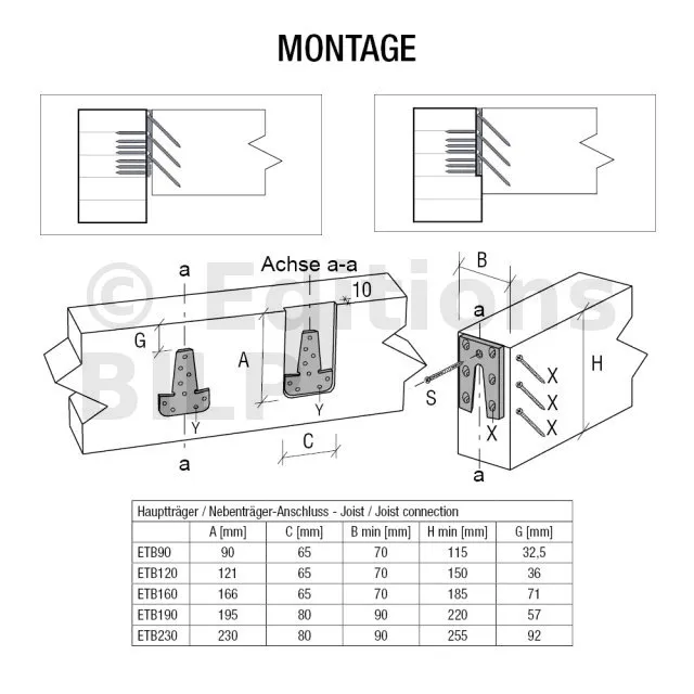 - Fixation bois/bois - type poutre/poutrePorteur : 6 x CNA4,0X50 ; Porté : 4 x vis SPAX-S5,0x80