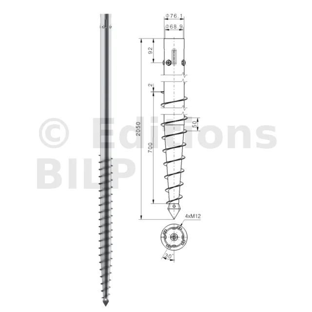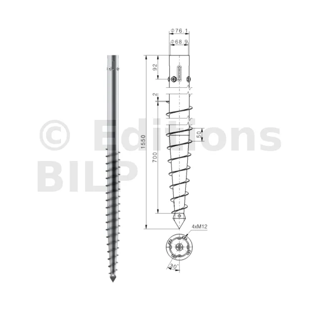 Une vis de fondation est donc composée d’un axe central avec :