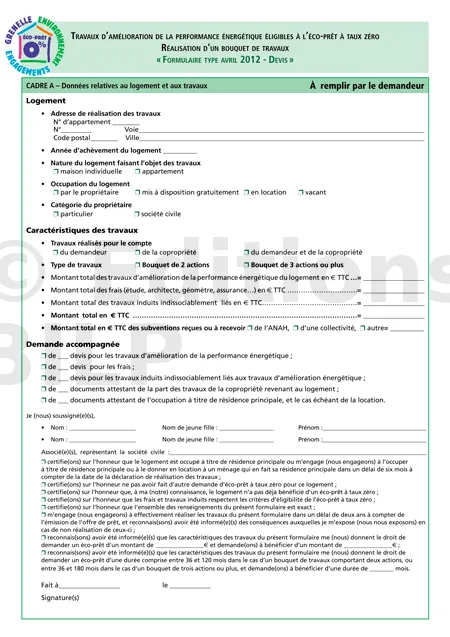 Les formulaires peuvent en partie être renseignés par le maître d’ouvrage. Ils doivent dans le même temps comporter des éléments techniques montrant que les travaux envisagés respectent effectivement les performances exigées par le dispositif Eco-PTZ : résistance thermique des matériaux, consommation d’énergie conventionnelle en énergie primaire du logement, rendement des dispositifs de chauffage …