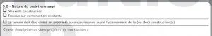 Cette partie est absente du formulaire propre aux maisons individuelles et/ou ses annexes, car ils ne correspondent pas à un projet d’aménagement.