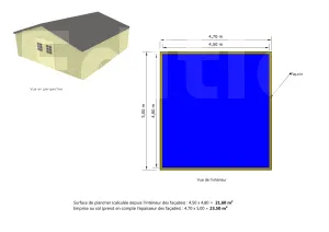Ci-dessous quelques exemples de calcul des surfaces pour un abri de jardin (les plans sont inspirés d’abris de jardin vendus dans le commerce).