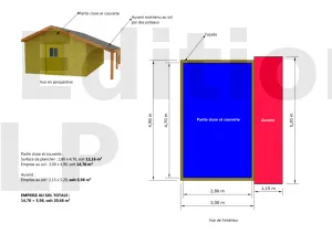 L’emprise au sol totale s’obtient en tenant compte à la fois la partie close et couverte, épaisseur des façades incluse, et également de la partie « auvent », car celle-ci est maintenue au sol par des poteaux de soutien.