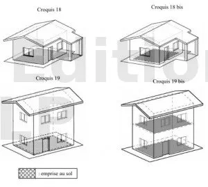 Croquis extrait de la circulaire du 3 février 2012. Schématiquement, l’emprise au sol est constituée par la base de la construction. Elle prend en compte l’épaisseur des structures de l’ouvrage. Toutefois, elle ne tient pas compte des avancées de toiture qui ne sont pas maintenues au sol par des éléments de soutien.
