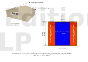 Dans cet exemple, la surface de plancher comme l’emprise au sol sont toutes les deux supérieures à 20 m². Un permis de construire est donc obligatoire de toute façon.