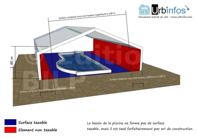 Le bassin lui-même n’est pas concerné par la surface taxable (il est taxé forfaitairement). En revanche, si vous installez un abri fermé au-dessus de la piscine, et que cet abri offre une hauteur libre de plus d’1,80 m, il créera de la surface taxable.