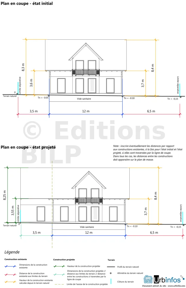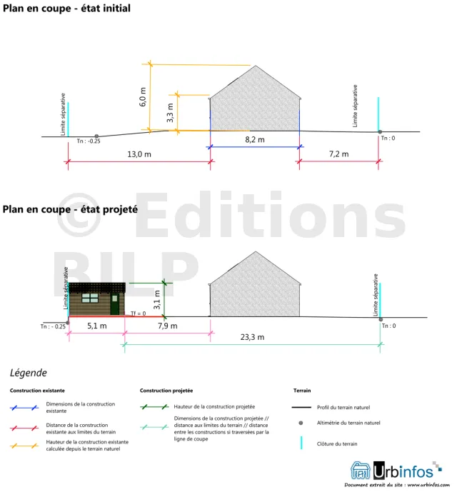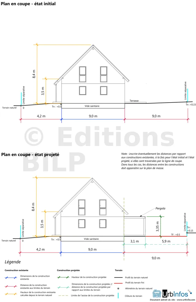 - L’état futur (ou projeté) : représente le profil du terrain naturel et l’occupation des constructions après travaux, notamment après déblaiement ou remblaiement.