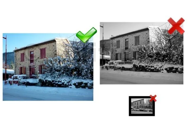 A gauche : le format et la résolution de la photographie sont largement satisfaisants. En revanche, les photographies de droite ne sont pas exploitables. Les photographies en noir & blanc ne permettent pas d’apprécier précisément l’architecture du bâtiment (quelle est la teinte des éléments de composition en façade ? quelles sont les matériaux utilisés pour la façade ?). La résolution de la photographie en bas à droite est quant à elle beaucoup trop faible.