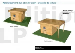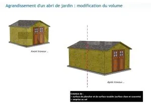 Agrandissement des dimensions d’un abri de jardin. Les surfaces nouvelles sont closes (façades de l’abri) et couvertes (toiture de l’abri). Elles développent donc à la fois de la surface de plancher, de la surface taxable et de l’emprise au sol (cliquez pour agrandir)