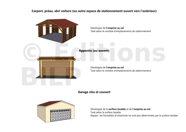 - Les **aires de stationnement closes et couvertes** génèrent de la surface taxable.