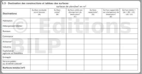 Dans le cadre « Destination des constructions et tableau des surfaces », **ne pas inclure** les surfaces de stationnement, car elles ne génèrent **pas** de surface de plancher. Un garage clos et couvert déclare sa **surface taxable** ailleurs dans le formulaire fiscal.