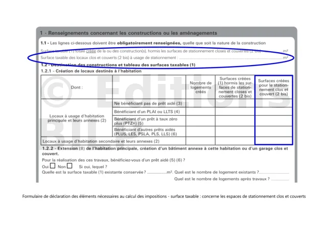 Formulaire de déclaration des éléments nécessaires au calcul des impositions. La surface taxable des espaces de stationnement clos et couverts à construire est renseigné dans les lignes prévus à cet effet (cliquez pour agrandir).