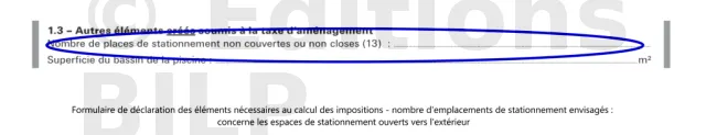 Le nombre d’emplacements de stationnement envisagés à l’occasion de l’installation d’une construction ouverte vers l’extérieur se renseigne à la ligne « autres éléments soumis à la taxe d’aménagement » du formulaire de déclaration des éléments nécessaires au calcul des impositions.