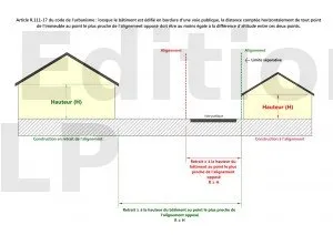 Un bâtiment en bordure de voie publique doit être implanté avec un retrait (R) au moins égal à sa hauteur (H) par rapport à l’alignement opposé (celui du terrain d’en face). La règle est : R ≥ H.