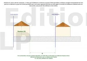 La règle est : R ≥ H/2 (minimum 3 m). Exemple : un bâtiment de 10 m de haut doit être à au moins 5 m de la limite ; un bâtiment de 5 m de haut doit être à au moins 3 m.