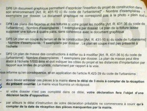 A défaut de présence de tous ces éléments, le dossier est déclaré incomplet ; une demande de pièce complémentaire est adressée au pétitionnaire dans le premier mois.