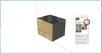 Étape 1 : Créez un cube et sélectionnez l’outil « colorier » placé sur la barre d’outils. Une fenêtre apparait : il s’agit de la fenêtre des matières. Cliquez sur l’ascenseur et sélectionnez un thème qui vous intéresse (l’ascenseur est ici entouré en rouge). Choisissez ensuite la matière que vous souhaitez utiliser en cliquant dessus.